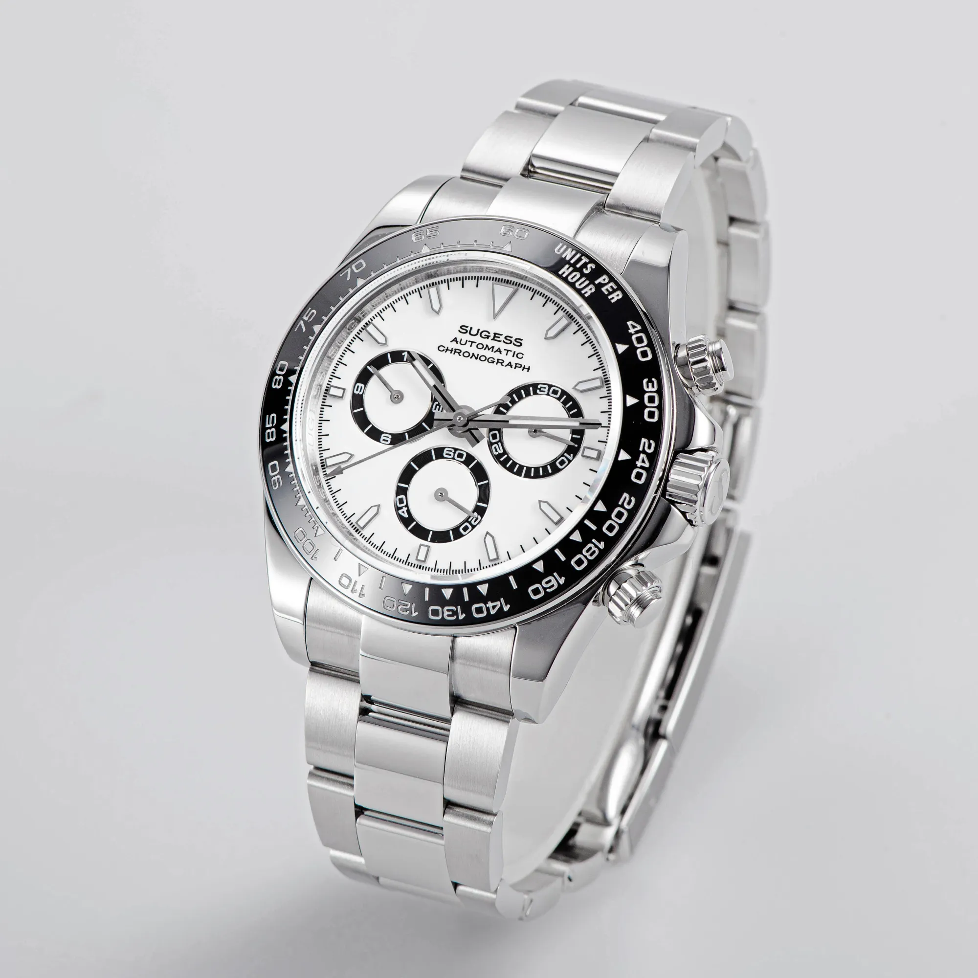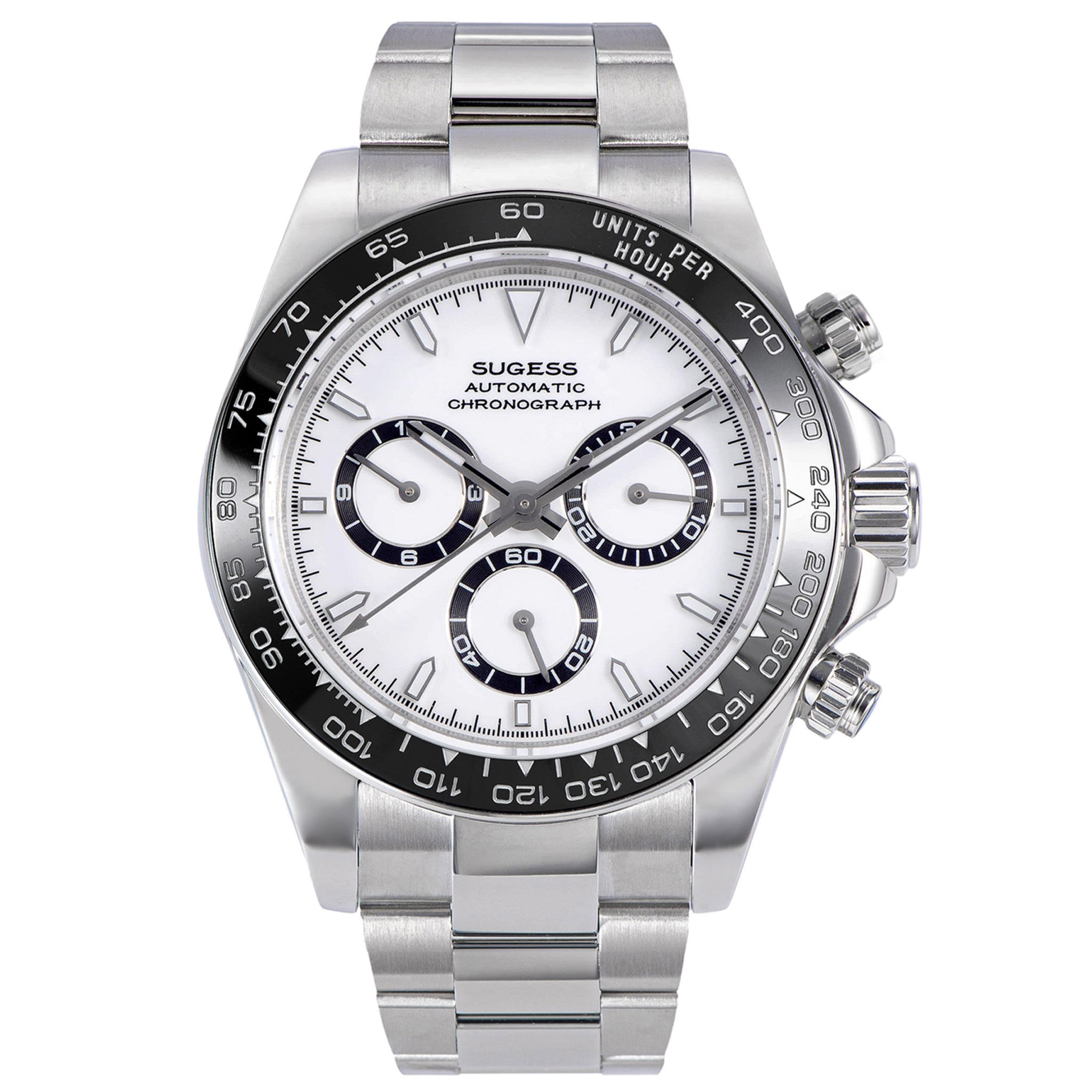 Brand: Sugess Condition: New with tags Series: Chrono Racing Model: S418-2.002 Function: 12 Hours and seconds Indicator, 12 Hours Chronograph Features: Oyster Bracelet, Screw Down Crown & Pushers, Luminous Hands Diameter: 39mm Thickness: 12.5mm Glass Material: Sapphire Crystal Case Material: 316L Stainless Steel Ba