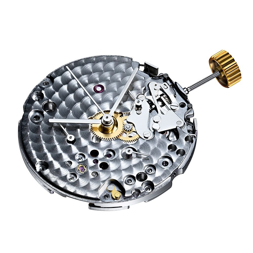 - Хронограф на колонном колесе, 30-минутный накопитель на 3, малая секунда на 6, 12-часовой накопитель на 9